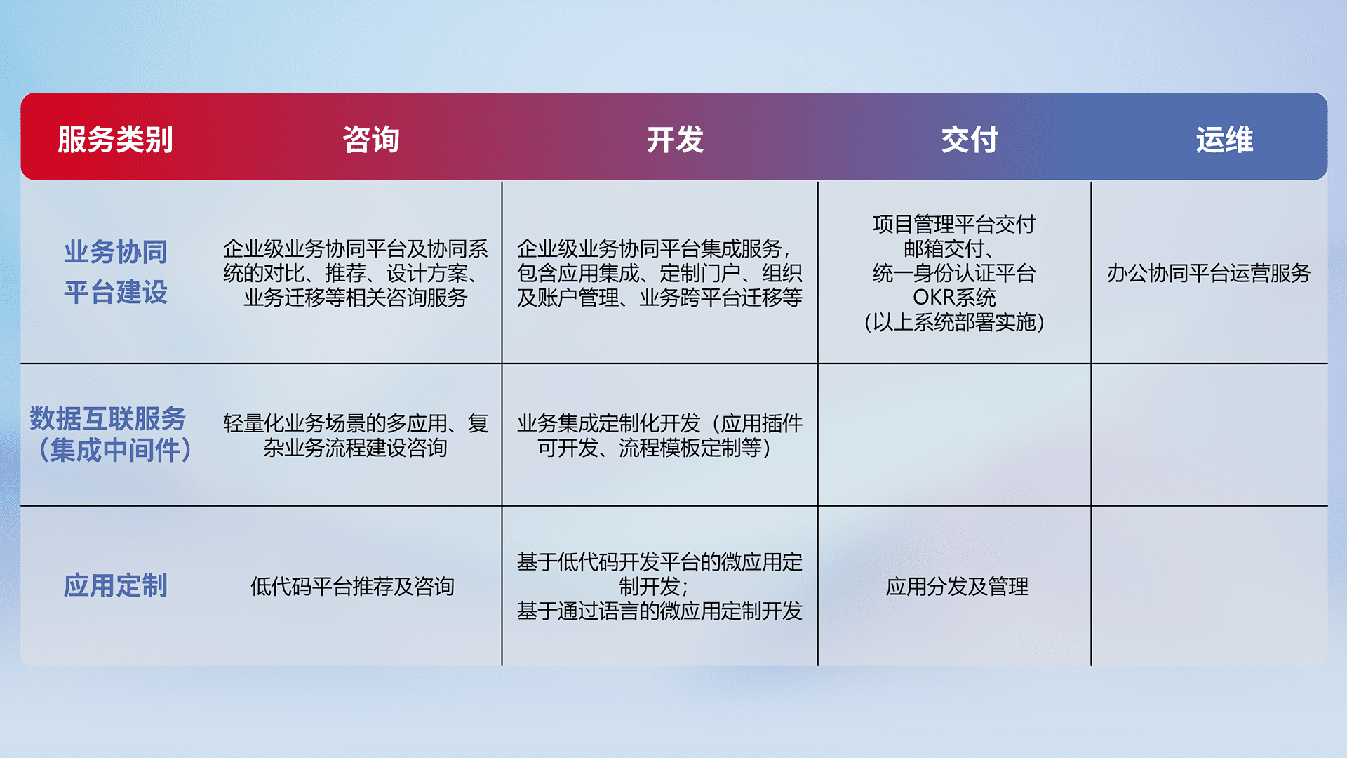 针对钉钉、、、企微、、、、IDaas等平台级产品提供产品的规划、、、、方案、、、交付、、、、定制化开发等服务,,,,实现如统一协同办公、、、、智能客户服务、、、混合会议管理、、、智能数据查询、、等业务场景,,,,实现数字化转型。。。。