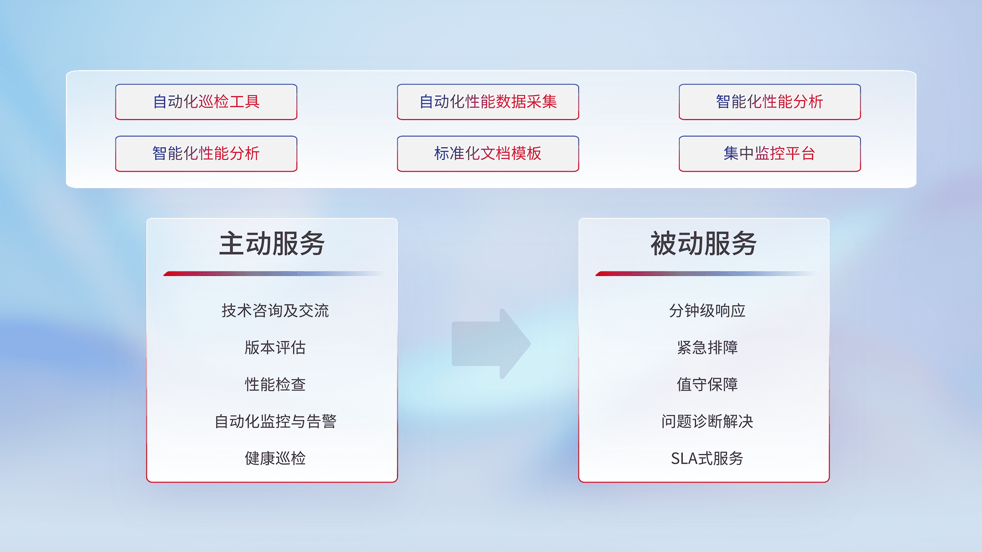 智能化工具和标准化文档,,,,保障服务质量,,,,提供主动服务(包含技术咨询、、、版本评估、、、性能检查、、、自动化监控与告警、、、、健康巡检)和被动服务包含(分钟级响应、、、、紧急排障、、、值守保障、、问题诊断解决、、、、SLA服务)。。。。